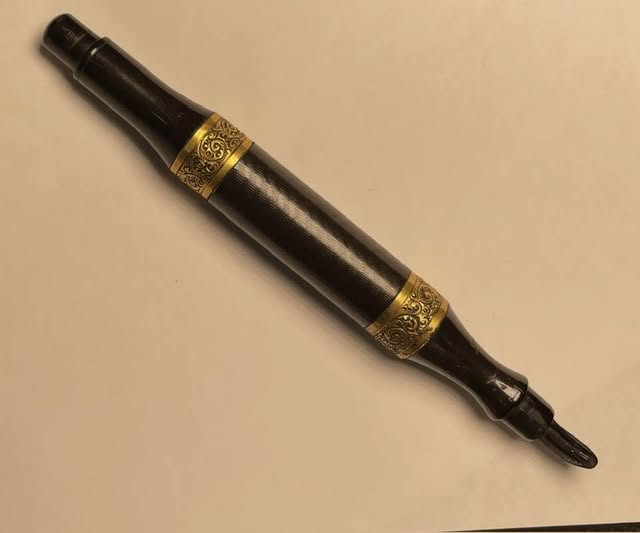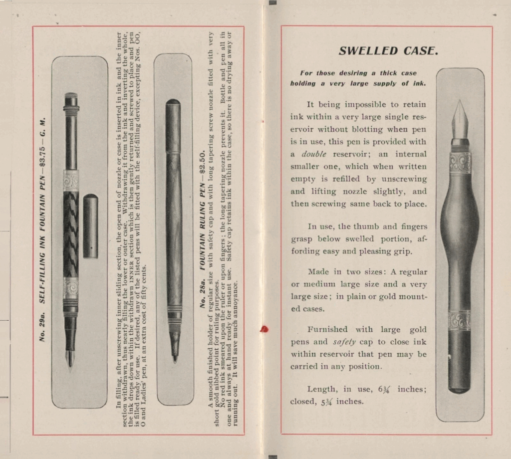 For quite some time, this was the only example of the Wirt double reservoir pen that I was aware of. It is huge. It is not imprinted, but clearly is the pen in the patent and the one intended by the ads. The ad shows a more rounded pen, which would have been more difficult to make on the lathe. I wonder if Wirt had a bit of P.T. Barnum in him, and advertised pens before they were produced and waited to see if there were orders. The patent describes using the large central portion of the case as a secondary reservoir. Down the middle is a more standard sized hard rubber tube that serves as the primary ink reservoir. The inner reservoir is open at the far end, but seals to the inside of the narrowed end of the barrel. When the section end is unscrewed, the narrower inner reservoir opens up to the outer secondary reservoir so it can be refilled. The pen is mentioned in a 1901 catalog, and I have subsequently seen a picture of one with bands, well worn. The catalog states it as a safety cap. neither example seen seems to have a true safety screw cap.